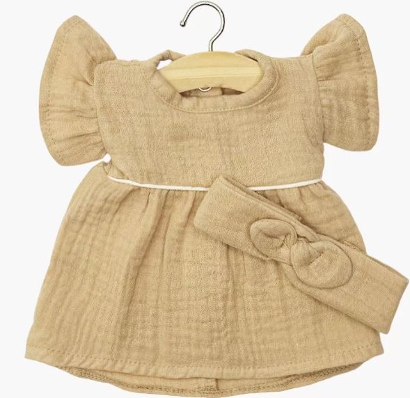 Cette robe Minikane couleur beige est confectionnée en coton, une matière noble et respirante. Sa teinte neutre apporte une touche parfaite à la garde-robe automnale des poupées Minikane.