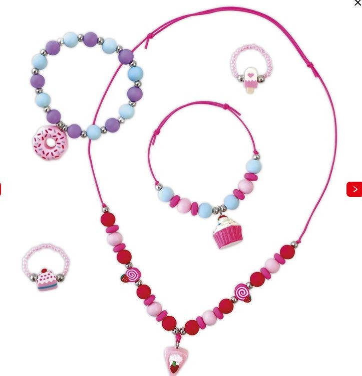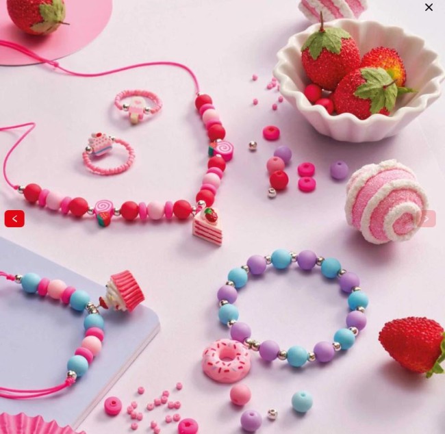 Ce coffret original permet de fabriquer soi-même 5 bijoux sur le thème des friandises et douceurs colorées : bagues, colliers, bracelets, tout est permis !