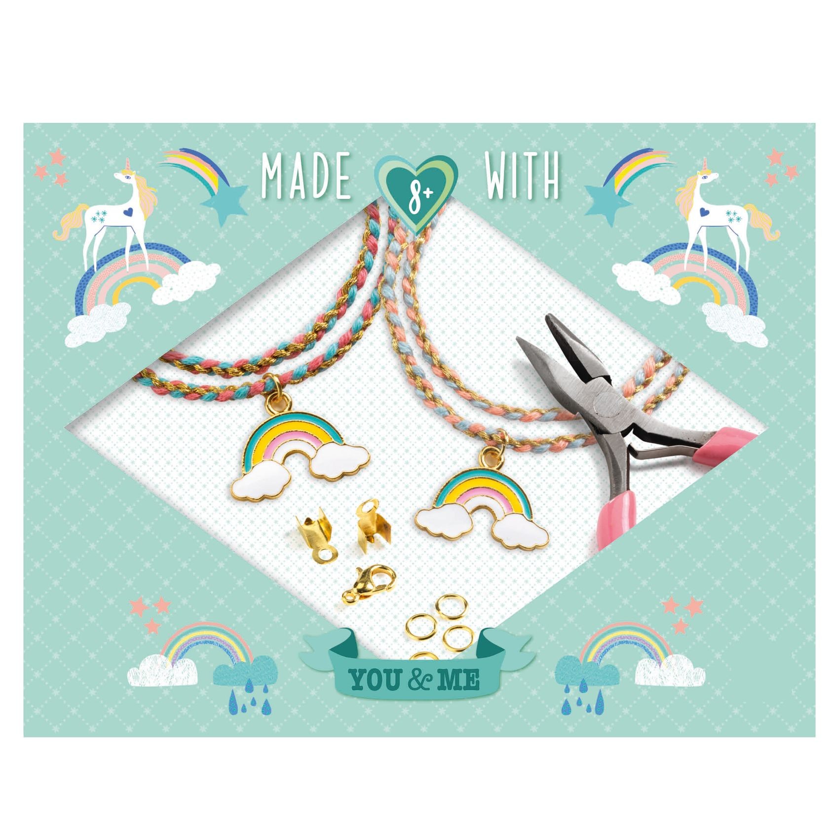 Ce kit DIY Djeco contient tout le nécessaire pour créer plusieurs bijoux : un assortiment de fils multicolores, de perles, et de charmes délicats en forme d'arc en ciel pour personnaliser chaque bracelet selon ses envies.