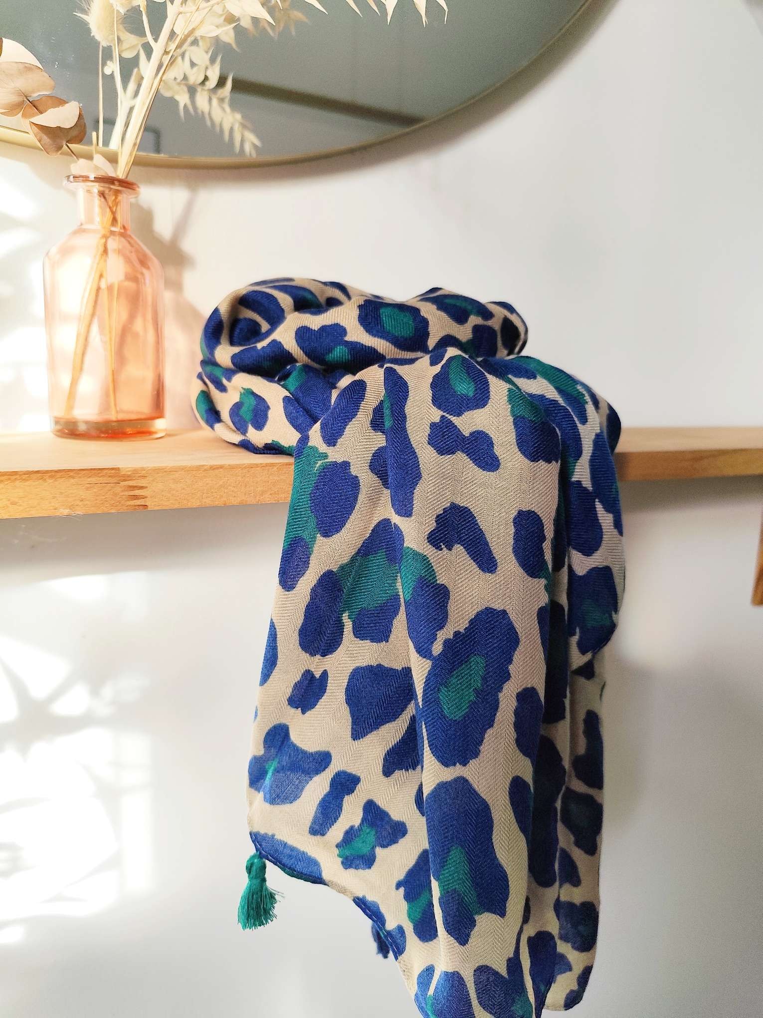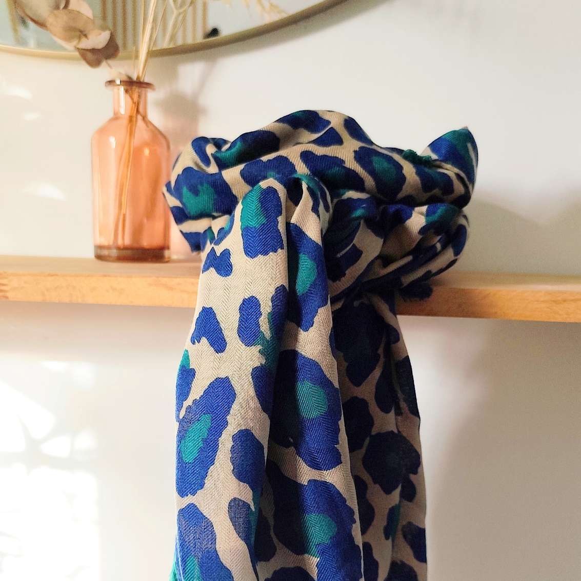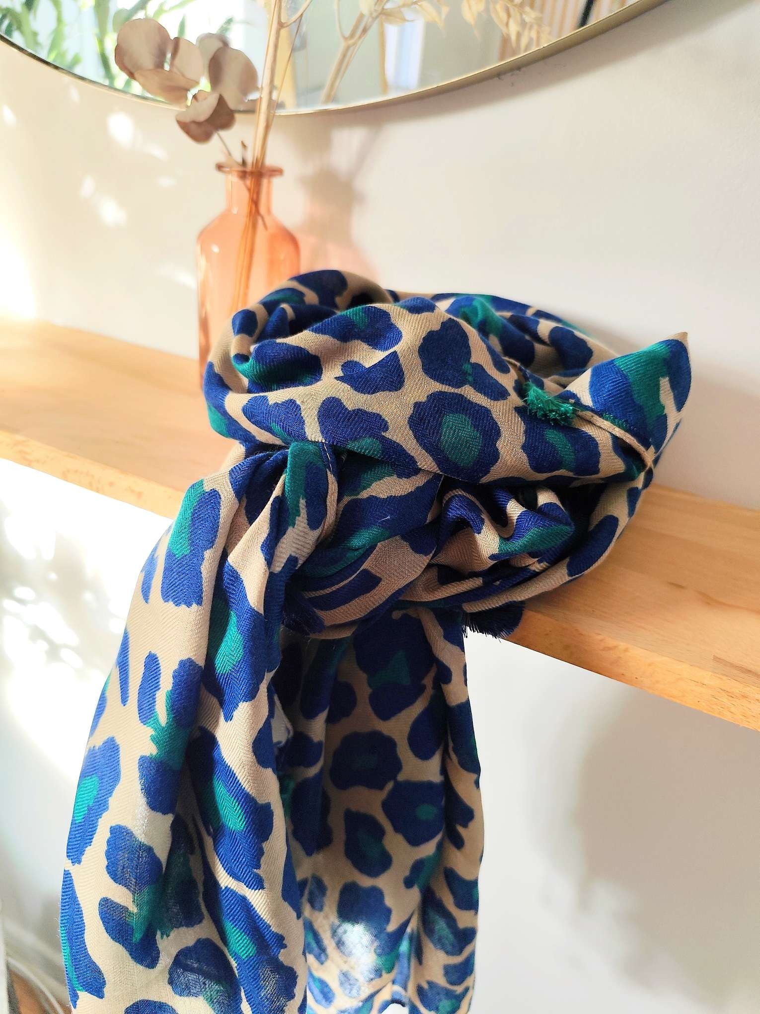 Découvrez notre écharpe toute douce fond beige, et tacheté bleu et vert , un véritable cocon de chaleur pour cet automne-hiver.