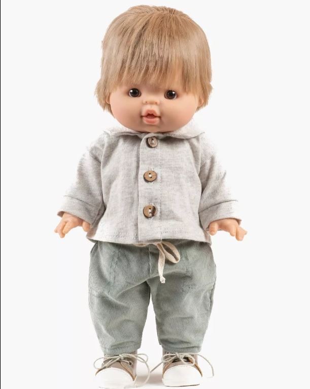 cette tenue complète pour poupée minikane garçon : pantalon vert d'eau et haut gris sublimera la poupée Minikane 34 cm. Idéale pour le jeu, la décoration ou les collectionneurs de poupées artisanales. On adore le joli biais au niveau des hanches.