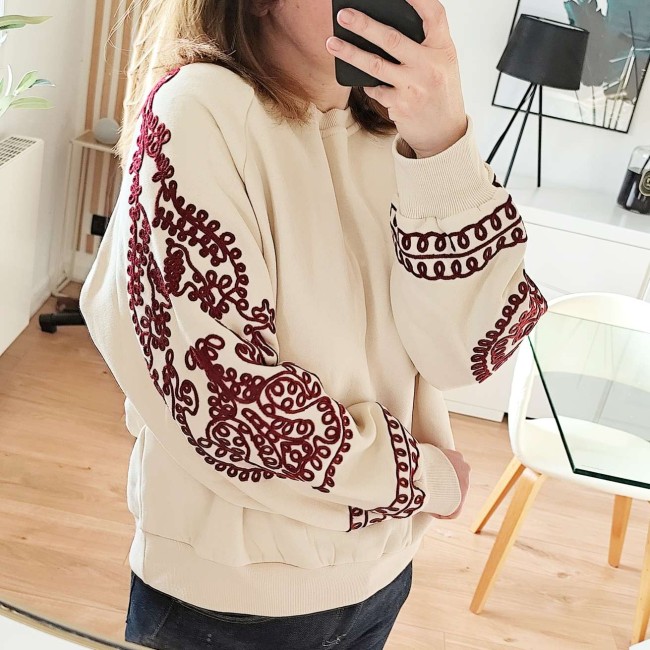 couleur beige avec détails brodés sur les manches de couleur bordeaux.