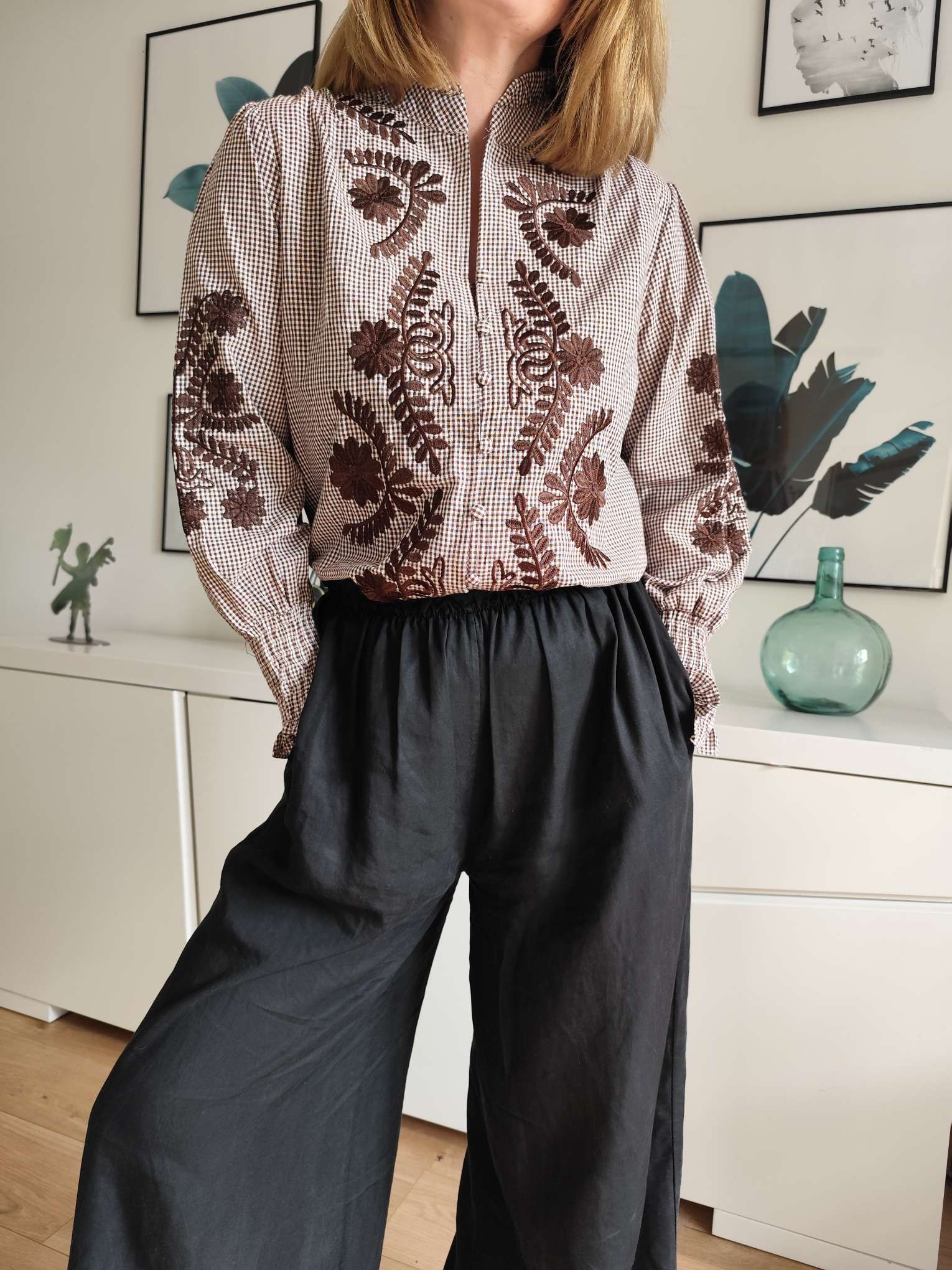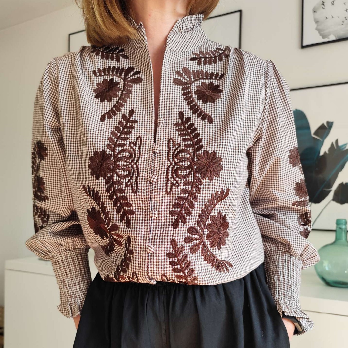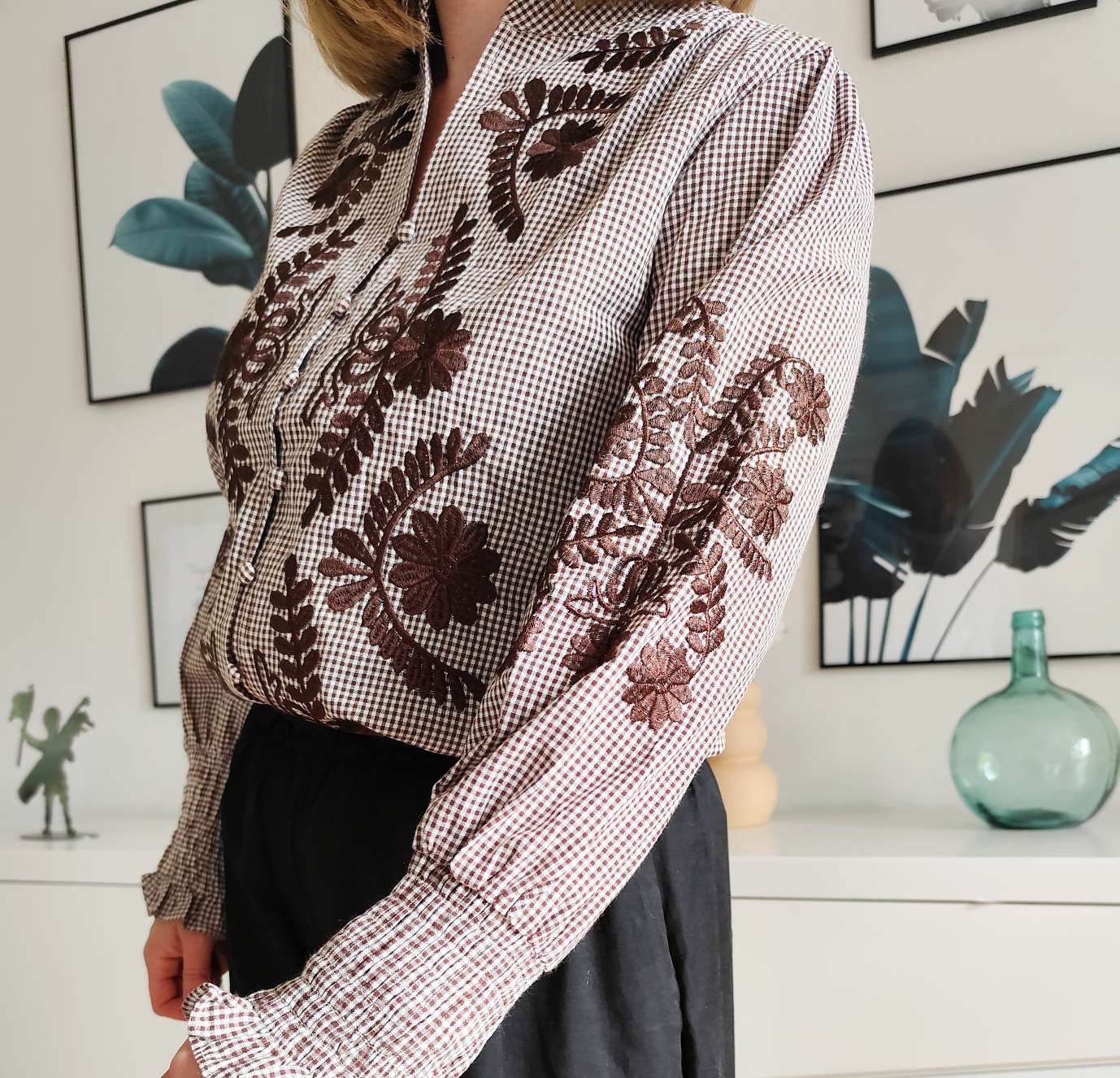 Chemise femme à carreaux et broderies marron - Elisabeth