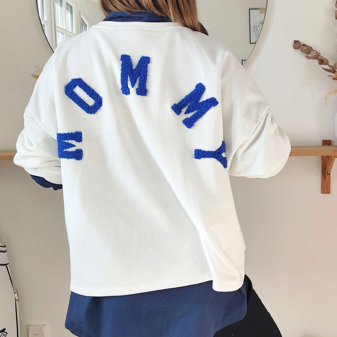 On l’adore pour sa coupe oversize tellement géniale, son inscription MOMMY en bouclette bleu roi plein de peps au dos.