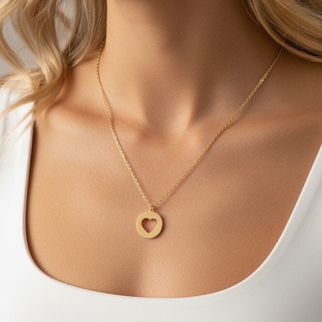La chaîne en mailles fines apporte de la légèreté visuelle et met parfaitement en valeur la médaille ronde au cœur ajouré. Le collier épouse joliment le cou sans effet massif. Son style intemporel traverse les saisons et les tendances.