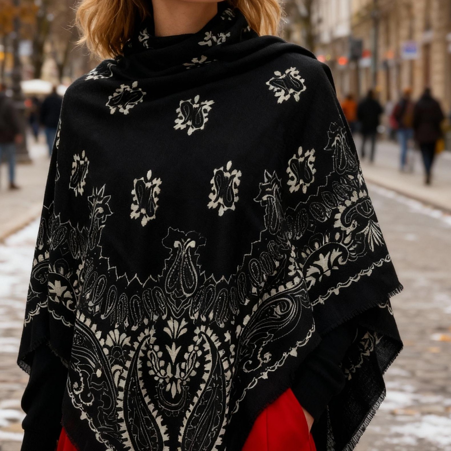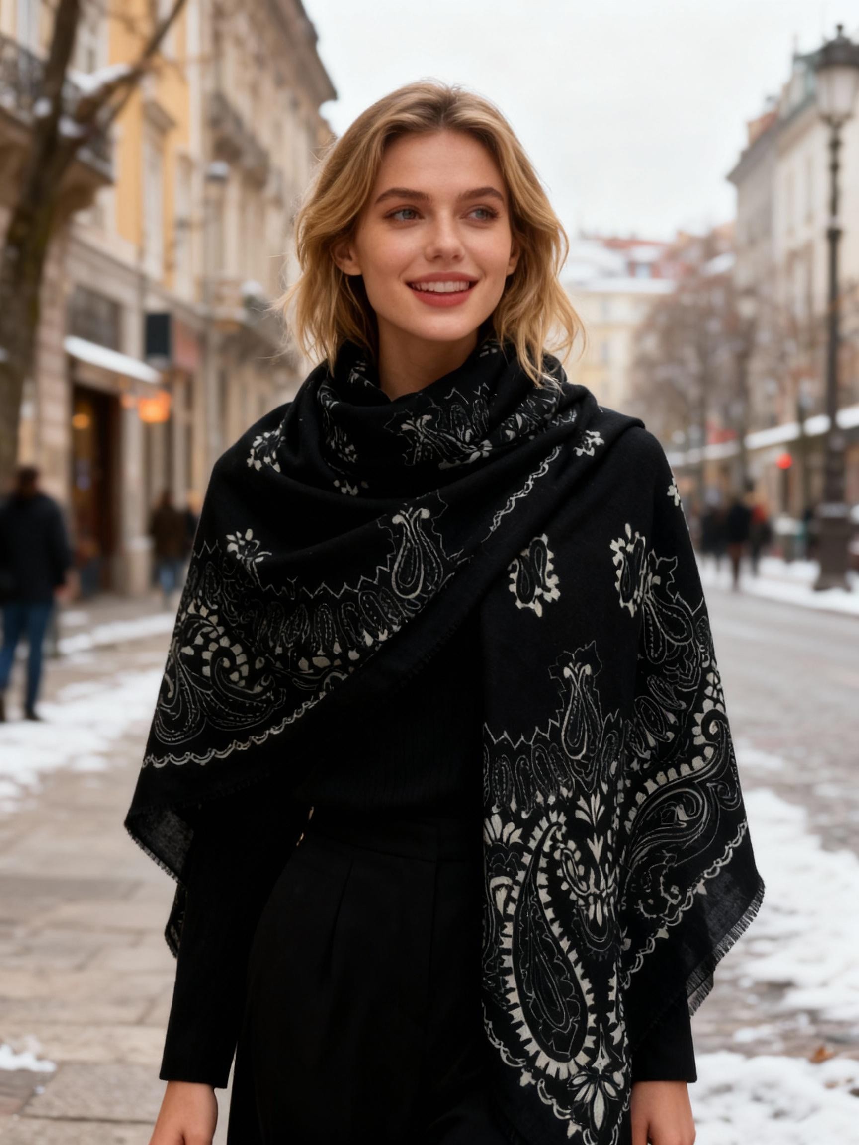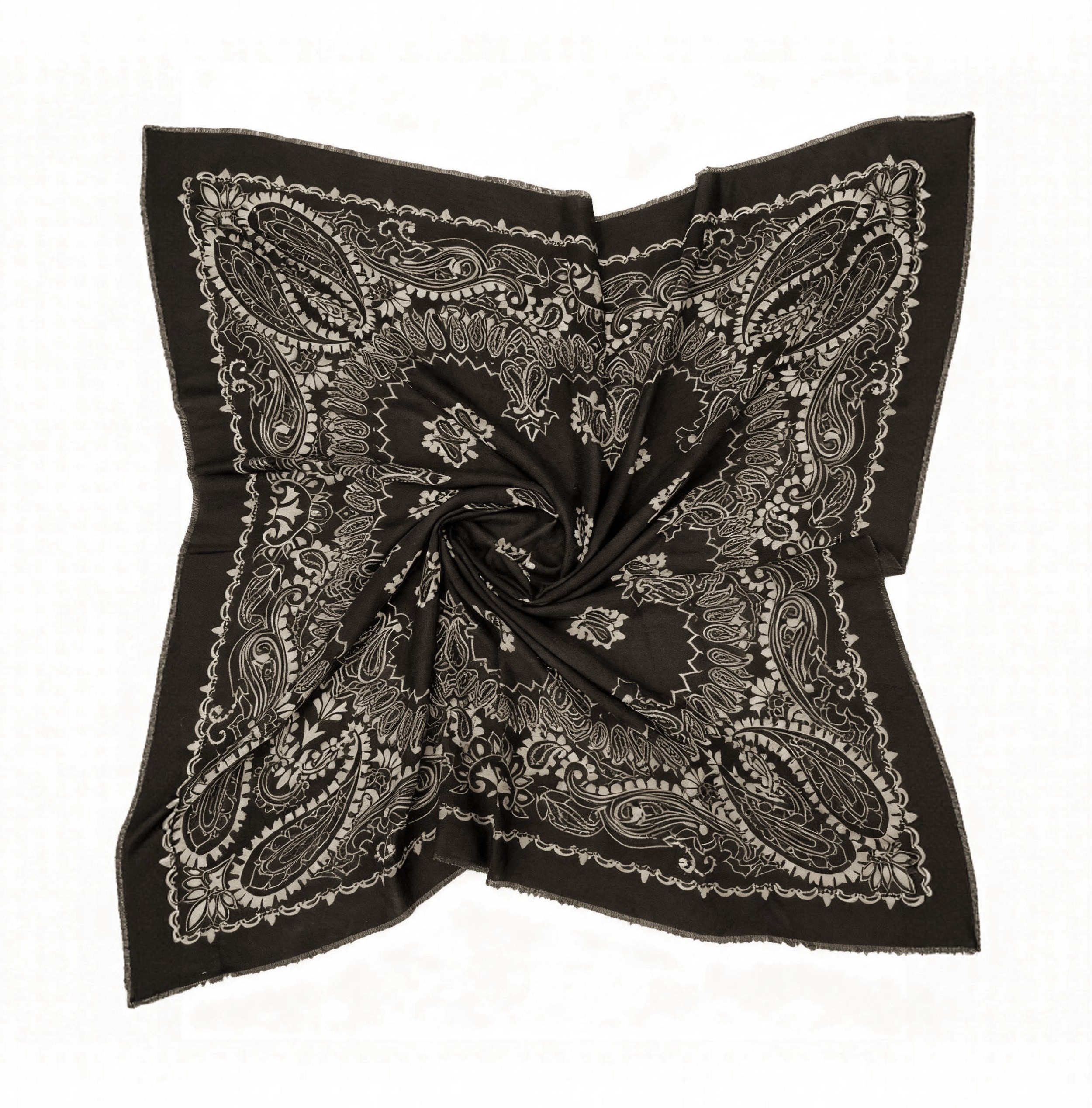 Découvrez notre écharpe toute douce noir, motifs façon bandana, motifs cachemire, un véritable cocon de chaleur.