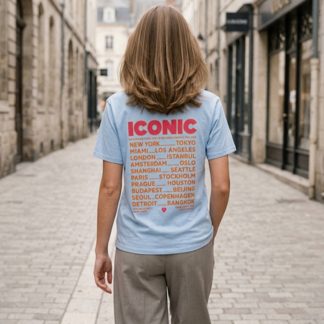 Sur le devant, une inscription « ICONIC » discrète apporte une touche minimaliste, tandis que le dos affiche un imprimé fort et assumé avec le mot ICONIC en grand, accompagné des noms de grandes villes emblématiques telles que New York, Tokyo, Miami, Los Angeles ou London, pour un esprit urbain et international très recherché.