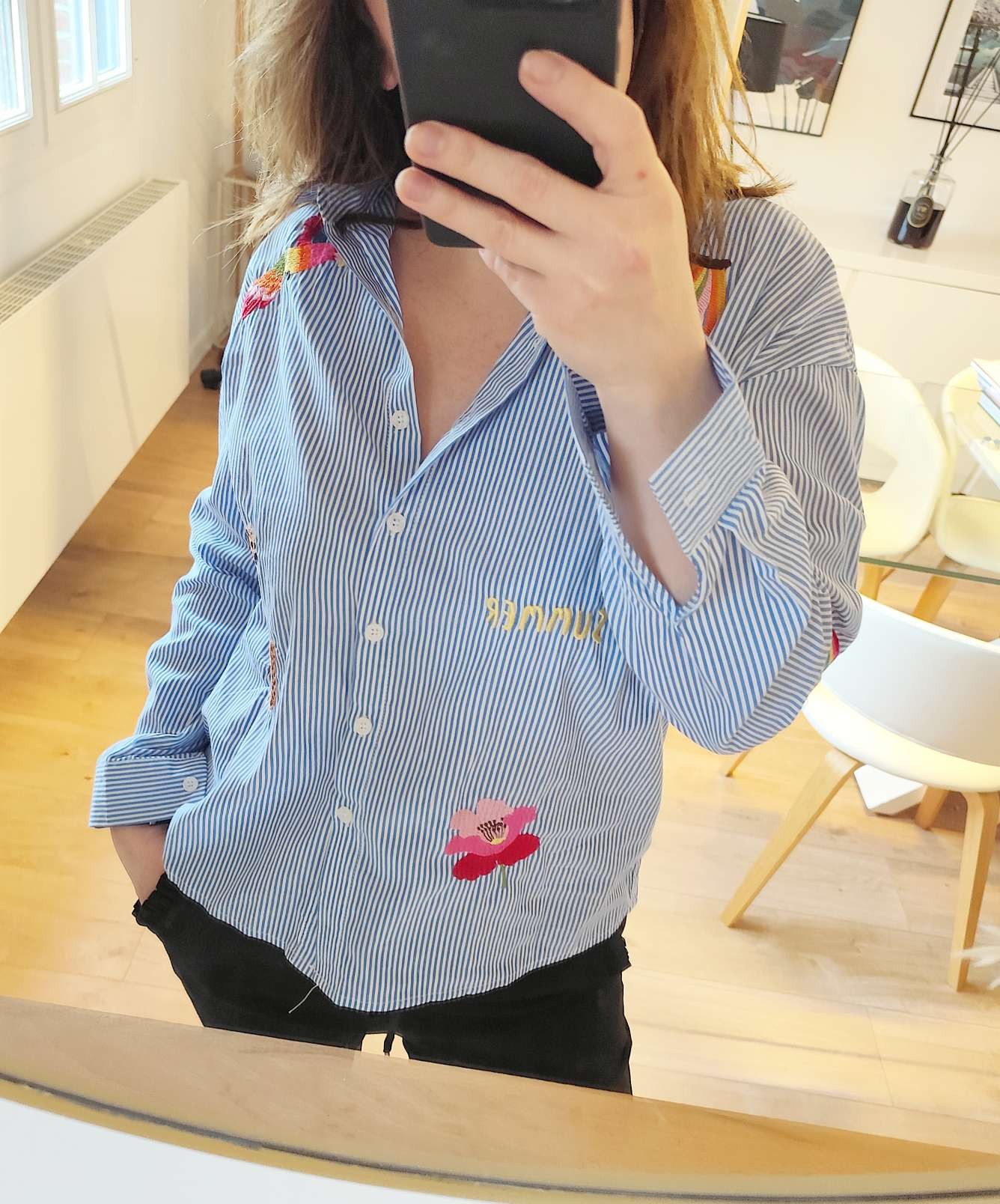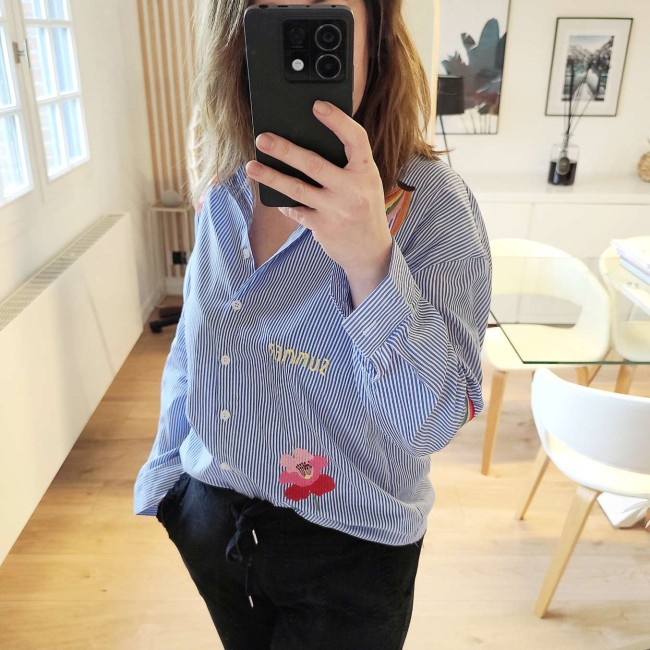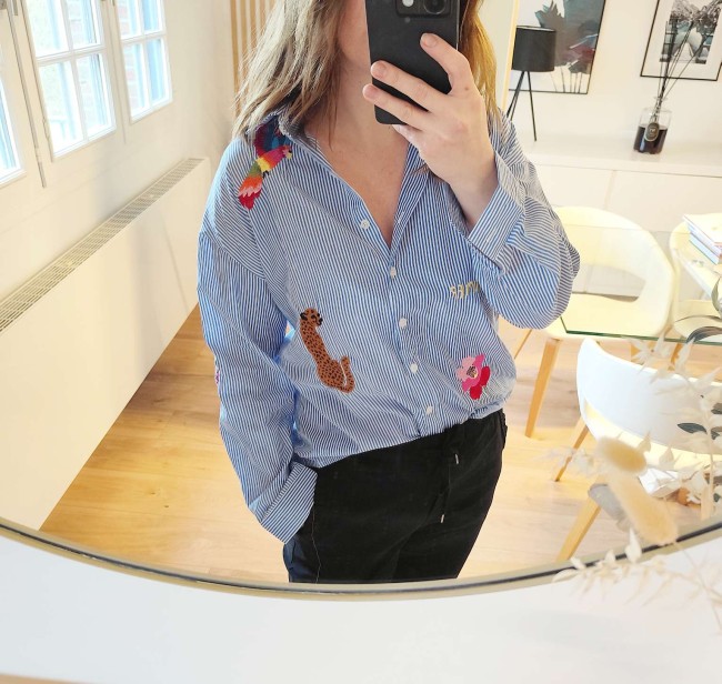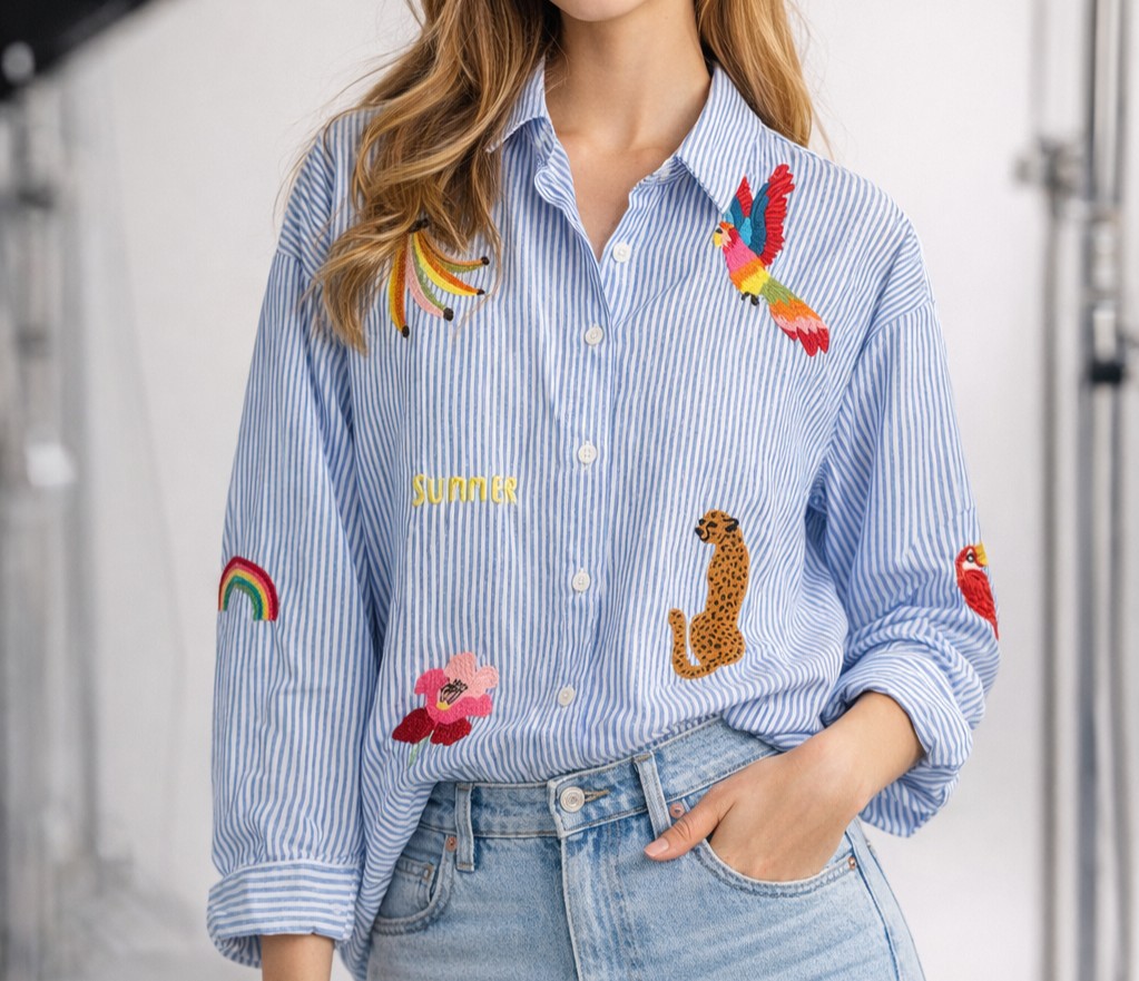La chemise Tropical est la pièce coup de cœur de la saison pour un look frais, lumineux et ultra tendance. Avec ses rayures blanches et bleu ciel, elle apporte une touche intemporelle et élégante, revisitée par des broderies colorées et originales qui font toute la différence.