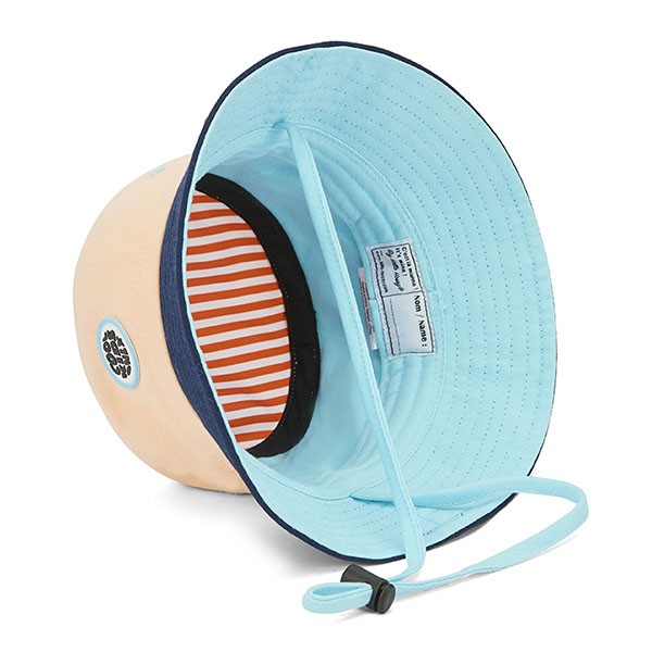 Craquez pour le bob bébé Hello Hossy Mini Soap couleur écru et bleu marine, un indispensable de l’été pour protéger votre enfant avec style.