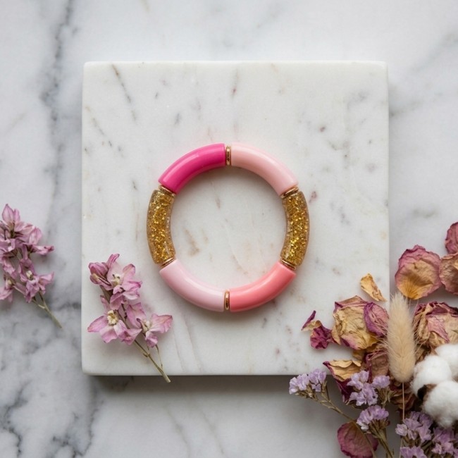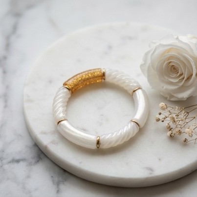 Le bracelet Albertine incarne l’élégance contemporaine avec une touche audacieuse. Composé de larges perles tubes en résine acrylique, il séduit par son design structuré et lumineux qui capte délicatement la lumière à chaque mouvement. Véritable pièce forte, il habille le poignet avec caractère tout en restant léger et confortable à porter.