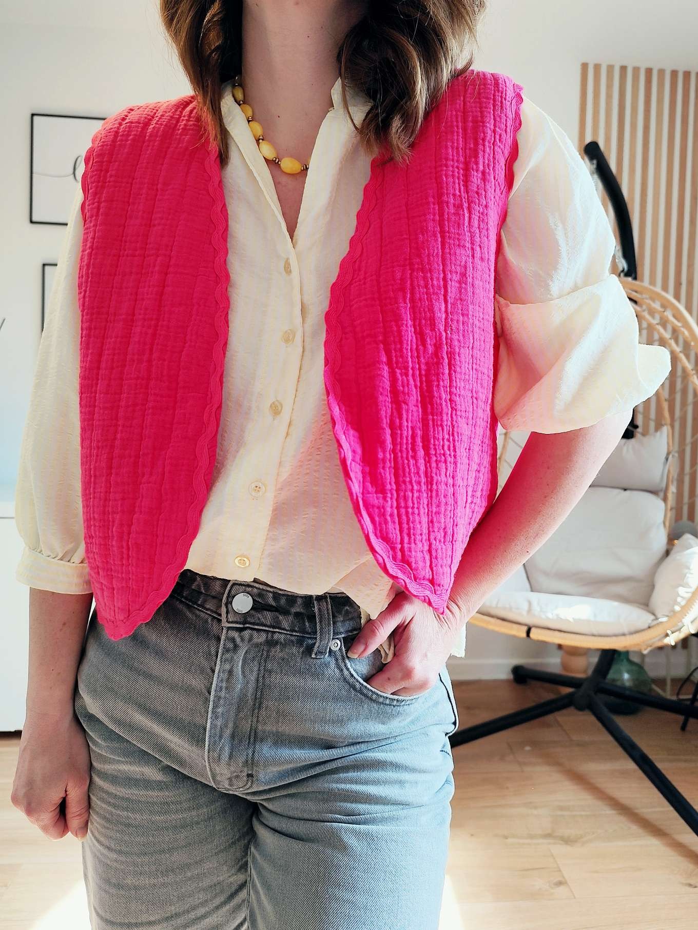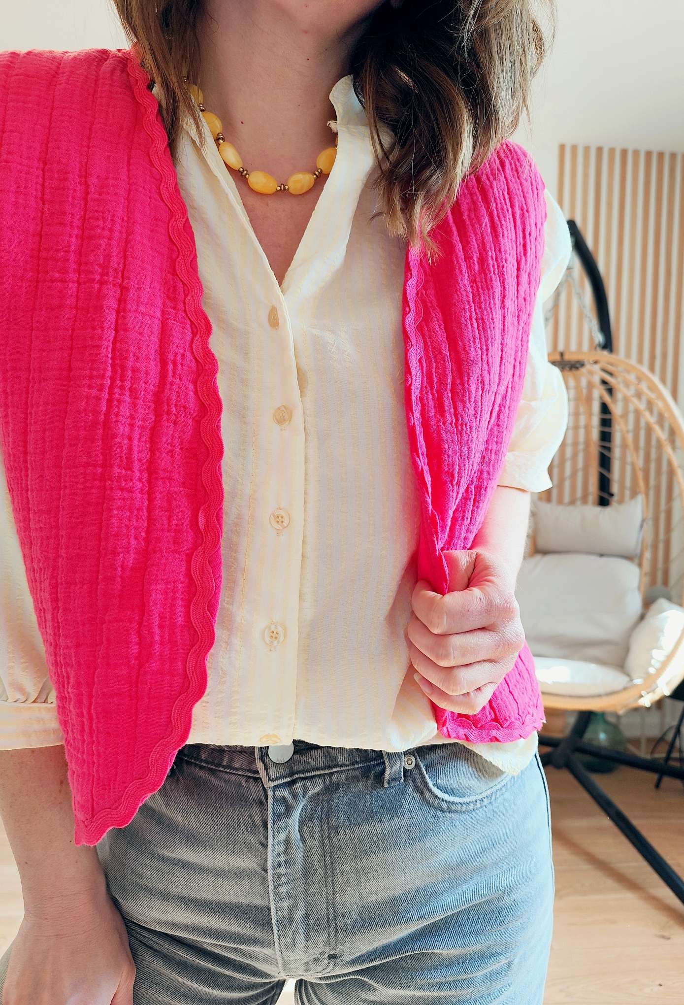 Sa coupe fluide et légère en fait la pièce parfaite à superposer, que ce soit sur une robe, un top ou une blouse.