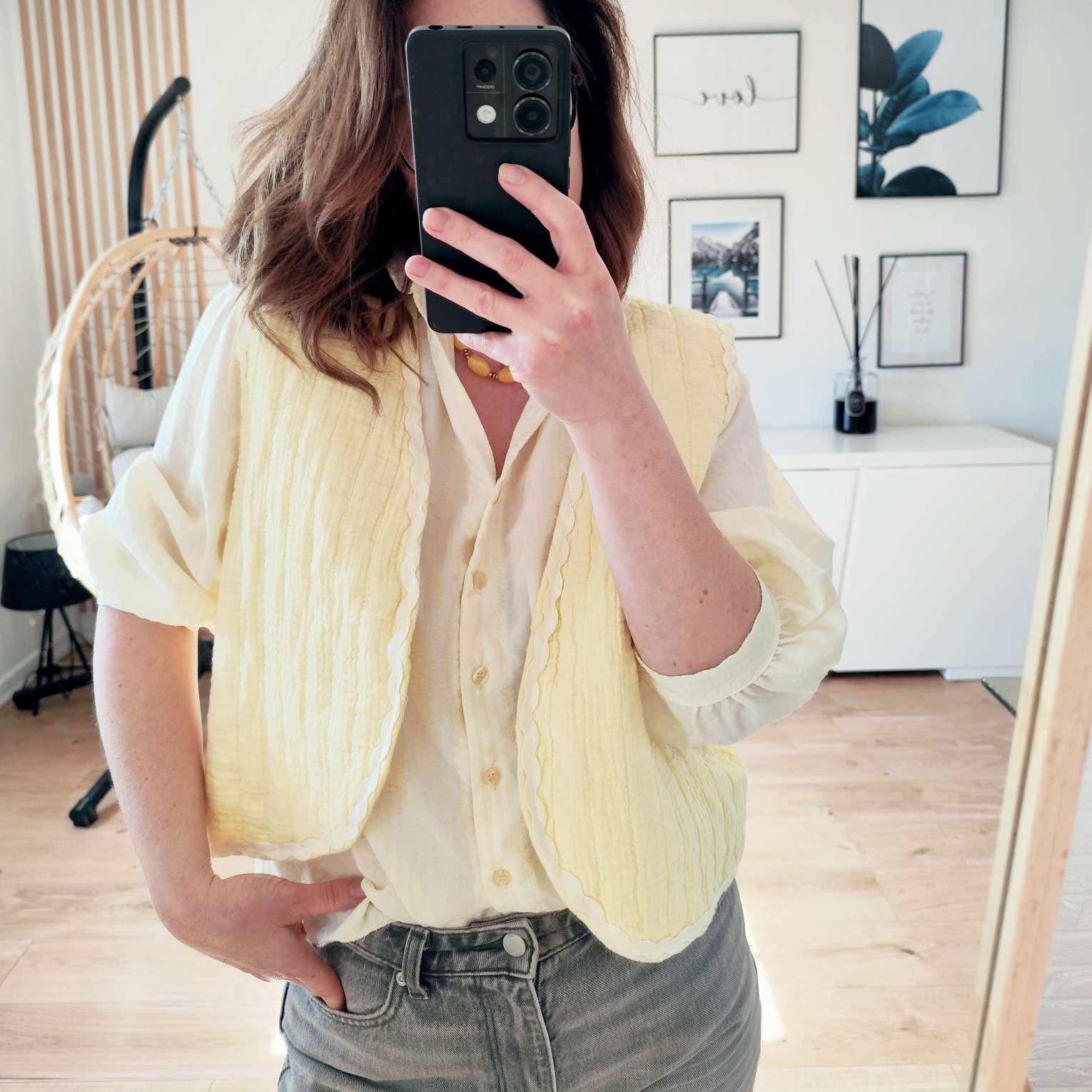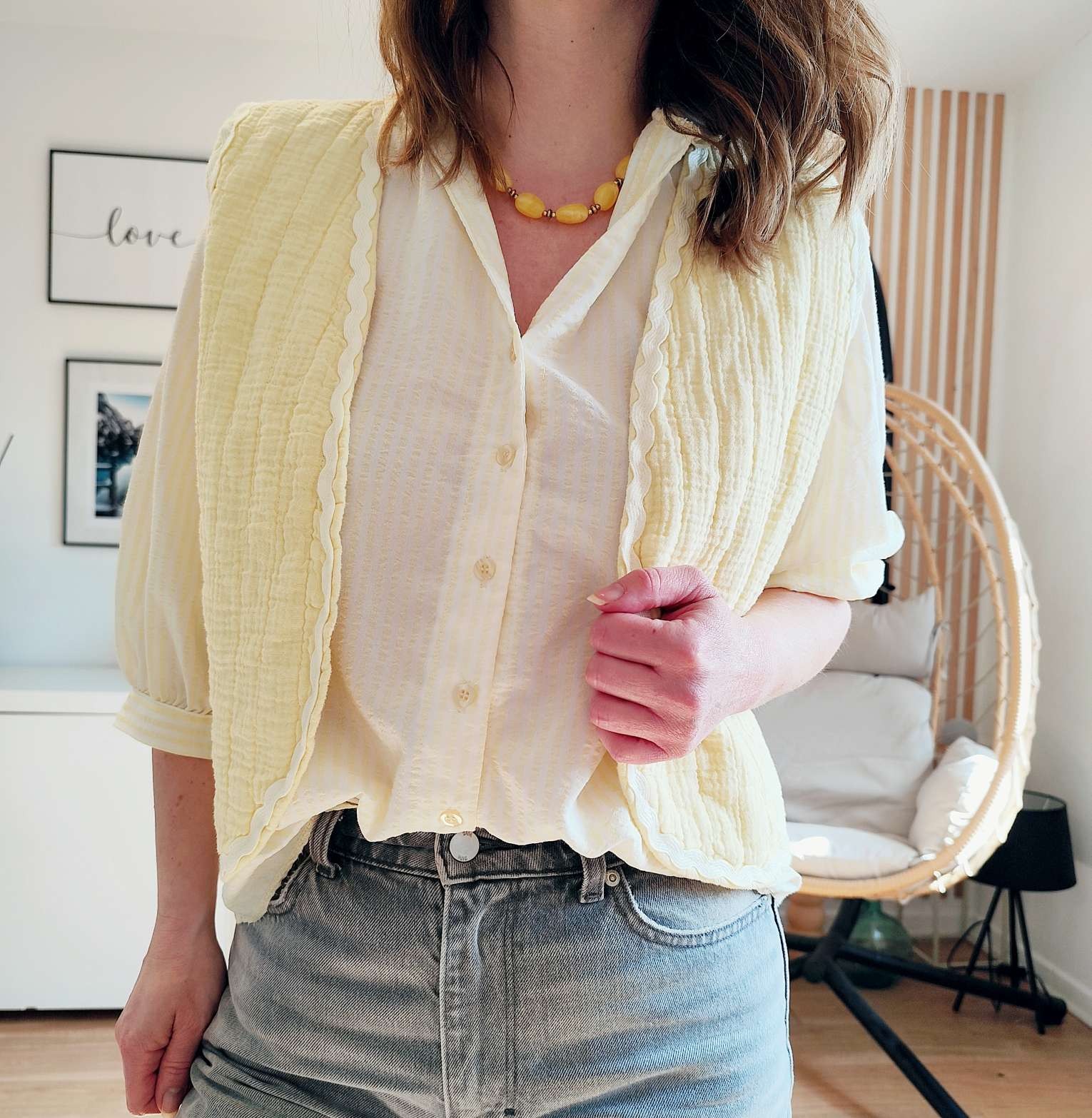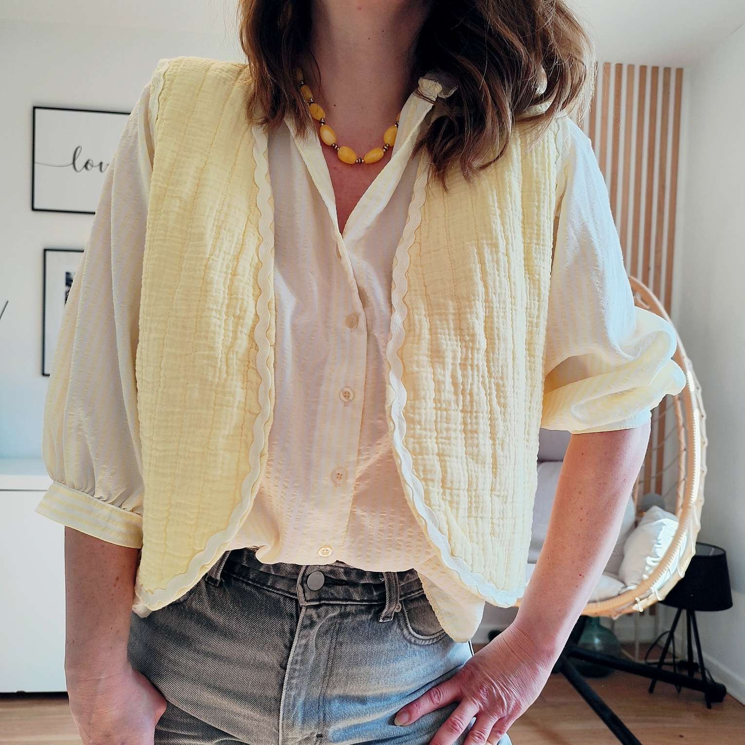 Apportez une touche bohème chic à vos tenues avec ce gilet sans manches style boléro aux couleurs solaire, dans un joli jaune doux et lumineux.