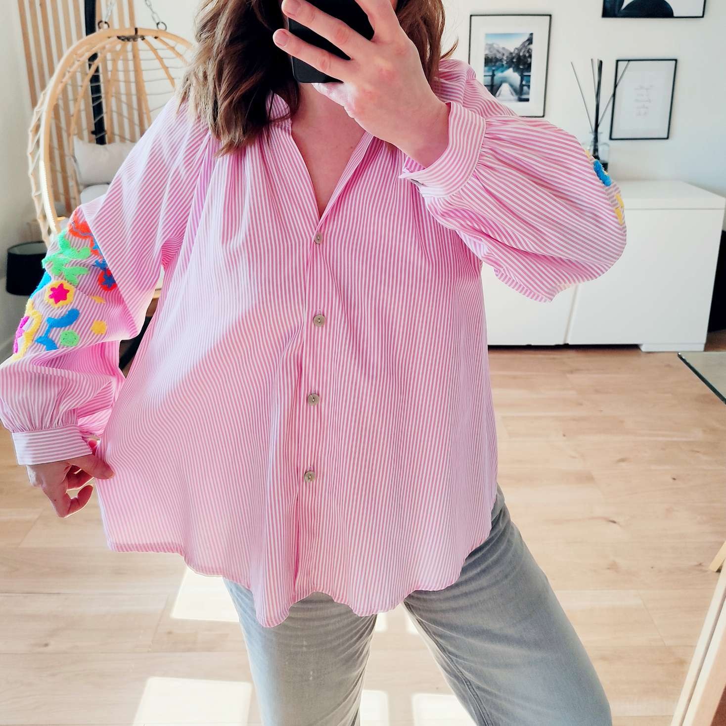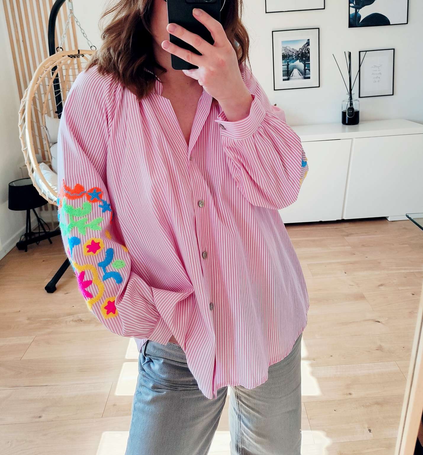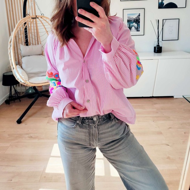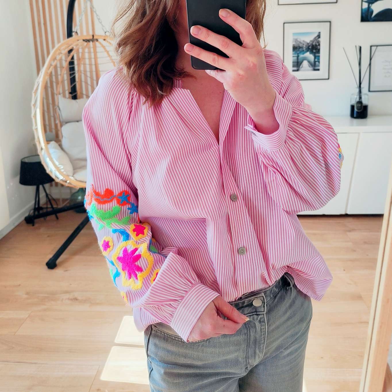 Ce qui fait toute la différence ? Ses magnifiques broderies florales aux touches fluo sur les manches, qui apportent une note audacieuse et moderne à cette pièce pleine de fraîcheur.