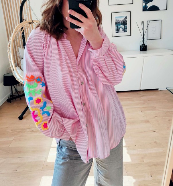 Couleurs : rayures rose et blanc, broderie fluo sur les manches.